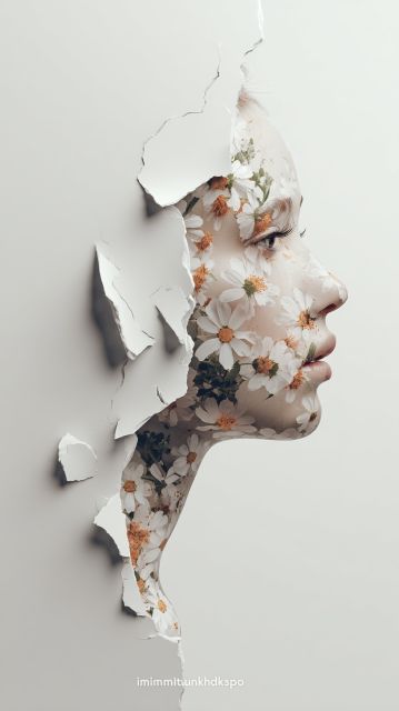 In an exquisite meld of nature and artistry, the portrait unveils a serene allure through its innovative design. Tender floral arrangements emerge from the contours of a woman’s silhouette, seamlessly merging human grace with the delicate strengths of nature. This artwork captures the essence of floral elegance, where each petal and leaf is intricately placed to suggest movement and life within the static sculpture. The colors are subdued yet vibrant, a paradox that evokes a sense of calm and contemplation. With every glance, viewers may find themselves absorbed into a gentle yet profound dialogue between the elements of nature and human presence, exploring themes of growth, beauty, and transformation.