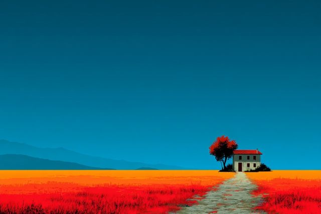 Imagine a world awash in the most striking hues of red and blue, where a solitary pathway guides you through a surreal landscape. This piece of art captures the essence of a dreamlike vista, with a vibrant red flower field that seems endless, stretching under a high blue sky. In the distance, blue mountains contribute to the aura of tranquility and mystery surrounding the scene. Near the horizon stands an inviting white house, crowned by a flourishing red tree that echoes the flower field's fiery tones. This artwork not only mesmerizes with its bold palette but also evokes a sense of serenity and isolation, perfect for contemplation or escapism. The stark contrast between the vivid reds and deep blues enhances the visual impact, making it an unforgettable statement piece. The composition draws the viewer into a world where color and simplicity create a profound narrative, one that resonates with anyone who appreciates beauty in its most elemental forms. Whether looked upon in moments of solitude or shared with others, this artwork continues to inspire and captivate with its poetic scenery and emblematic solitude.
