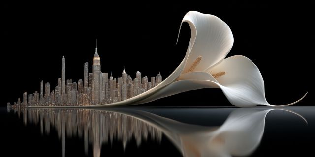 Envision a world where nature and urban life exist in seamless harmony. This image exemplifies such a reality, portraying the delicate elegance of two giant calla lilies that stretch gracefully over a reflective surface towards the glowing, illuminated Manhattan skyline. The graceful curves of the lilies, with their pristine white petals and rich, gold pistils, offer a stark yet harmonious contrast to the sharp, defined lines of the celebrated buildings. As night deepens, the lilies seem to be whispering secrets to the city that never sleeps, under a sky so clear that the scene reflects perfectly upon the still water below. This captivating visual juxtaposition invites observers to contemplate the beauty and resilience of nature amidst human achievement. The artwork serves as a metaphor for integration, suggesting that urban landscapes and natural elements can coexist in beautiful, unexpected ways. The lilies, towering and statuesque, become guardians of the city, bringing a message of peace and serenity to the bustling city life. Every detail from the shimmering lights of the skyscrapers to the subtle texture of the lilies' petals is rendered with crisp clarity, creating a visual feast that is as thought-provoking as it is beautiful.