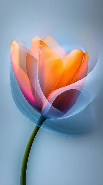 Amidst a serene backdrop of soothing blues and subtle grays, a solitary tulip emerges, glowing with an internal light of vibrant oranges and gentle pinks. This artwork captures the tulip not just as a flower, but as a mesmerizing beacon of grace and tranquility. Each petal seems to dance with color, the edges tinged with a mysterious neon glow that contrasts starkly with the soft, dream-like quality of the surrounding space. The tulip's form is enhanced by a delicate swirl, encircling it like a gentle embrace of wind, enhancing the sense of motion and ethereal beauty.