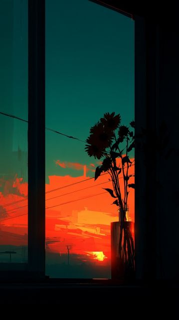 Capturing the quiet splendor of twilight, "Sunset Silhouette" brings the serene beauty of a fading day to the canvas. In this evocative piece, sunflowers sit poised in a slender vase by a tall window, their outlines dramatically backlit by a vibrant sunset. Drenched in hues of deep orange, fiery red, and soothing teal, the setting sun paints a breathtaking canvas of colors, lending a dreamlike quality to the scene. As the sky shifts from bright azure to rich amber, each petal and leaf of the silhouetted flora is etched against the incandescent backdrop, creating a study in contrasts. This artwork transports viewers to a serene moment where the hustle of the day melts away and all that remains is the soothing dance of colors in the sky. The glass of the window catches reflections that hint at a world winding down, inviting contemplation and calm. “Sunset Silhouette" emerges not only as a striking visual feast but also as a reverie of the day’s end, perfect for any collector who appreciates the profound connections between nature and art.