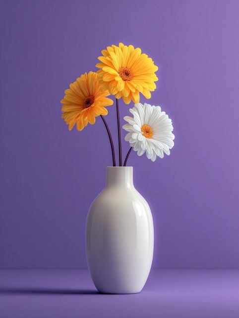 In an evocative display of simplicity and elegance, a trio of vibrant flowers springs forth from a sleek white vase against a lush purple backdrop. The scene captures a delightful contrast of colors, where the fiery orange and pristine white petals burst with life, radiating warmth and purity. Each bloom, perfectly poised, exudes a unique character, their slender stems arching gracefully from the mouth of the vase. This minimalist composition not only celebrates the beauty of flowers but also plays with color theory, using complementary shades to enhance the visual impact. The purple hue of the background adds depth and vibrancy, enriching the scene and drawing the viewer's eye directly to the soft, detailed texture of each petal. The image is a testament to the timeless allure of floral art, a blend of natural wonder and artistic interpretation that invites viewers to pause and embrace a moment of serene beauty. This floral artwork is an ode to the subtle interplay of light and color, designed to evoke emotions and beautify any space with its elegant simplicity.