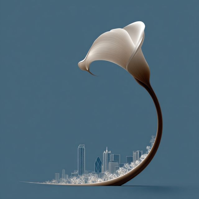 Step into a scene where the boundaries between the organic and the architectural blur into a harmonious tableau. At first glance, one might perceive a simple, elegant flower blooming in solitude against a deep blue sky. The delicate curves and refined texture of the flower suggest a world of gentle beauty, reminiscent of a serene early morning when nature awakens in whispered tones. However, this work transcends typical floral art. Emerging from the graceful stem of the flower is an intricately crafted miniature cityscape, bustling with towering skyscrapers and emblematic structures that denote a thriving metropolis. Each building is rendered with such precision that you can nearly hear the distant hum of city life. The stark contrast between the soft, flowing lines of the natural element and the sharp, angular forms of the urban environment invites viewers to reflect on the interplay between man-made wonders and natural splendor. This piece evokes a sense of calm yet stimulates curiosity about the coexistence of different realms. It challenges the viewer to find beauty and symmetry in unexpected combinations, making it a profound statement piece for any collector.