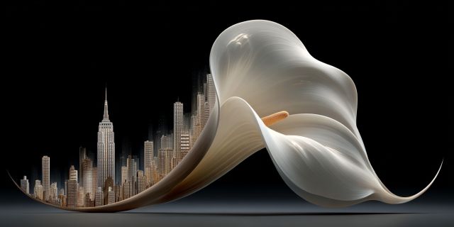 In an evocative blend of natural beauty and urban sophistication, this artwork presents a surreal fusion where organic forms and metropolitan vistas coalesce. The piece masterfully juxtaposes a gigantic, elegant calla lily against the iconic New York City skyline. The soft, flowing curves of the lily gracefully arc over the bustling city, suggesting a harmonious balance between the natural world and human achievement. The flower's pristine white petals, translucid and glowing, emerge from the darkness, their curves mimicking the undulating rhythm of the city's architectural contours. Below, the meticulously detailed skyline reveals recognizable landmarks bathed in a chiaroscuro effect of light and shadow, enhancing the three-dimensional feel of the scene. This composition not only captures the viewer’s eye but also invites contemplation of the delicate interplay between nature and constructed environments. The artwork, resembling a moment frozen in time, encapsulates a narrative of resilience and beauty, symbolizing hope and rebirth within the concrete jungle.