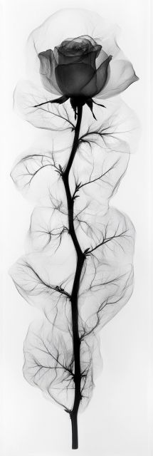 With the first gaze, the ethereal grace of this monochrome floral artwork captivates and intrigues, inviting deeper reflection and emotional response. A single rose stands proudly at the apex, its petals meticulously sculpted as if by nature's finest artist, rendered in shades of whispering gray against a stark white background. Beneath, the stem reveals a labyrinth of veins, a delicate yet resilient support system, mimicking the intricate workings of life's unseen forces. Surrounding the rose, diaphanous leaves, reminiscent of fragile silk, cascade in an elegant sweep, their transparency a metaphor for vulnerability and strength intermingled.