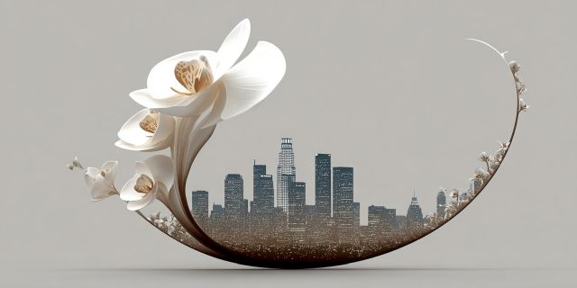 Envision an exquisite harmony where the fervor of the urban sprawl meets the serenity of nature's beauty. This art piece showcases an innovative blend, positioning delicate white flowers arching gracefully over a nuanced city skyline. Each petal, pristine and sculpted, contrasts with the distant high-rises, their metal and glass facades depicted in miniature yet striking detail. This fusion not only captures an uncommon alliance between botanical and architectural elements but also evokes a sense of balance and peaceful coexistence. The curve of the floral crescent seemingly protects or embraces the city, suggesting a symbiotic relationship between the natural world and human innovation. Mid-tones and muted backgrounds let the viewer's eye focus on the detailed textures of the blossoms and urban silhouettes, making this artwork a testament to the delicate intersections in our world. Not just a visual treat; it's a narrative of integration, symbolizing hope and cohabitation in environments we inhabit. As light seems to emanate from the flower's core, it casts a gentle glow over the city, infusing the piece with an almost magical quality that bridges reality and imagination.