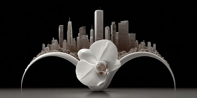 Imagine the pulse of a metropolis blended seamlessly with the serene grace of a delicate orchid. This artwork merges a bustling city silhouette with a pristine white orchid, positioned as though cradling the urban expanse in its petals. Each building, meticulously crafted within grains of granular texture reminiscent of tiny rocks or coarse sand, contrasts with the smooth, flowing lines and soft luminescence of the orchid. The composition is a study in contrasts: the hard, angular lines of the cityscape against the soft, curvilinear form of the flower; the monochromatic hues of the urban environment against the vivid, stark whiteness of the bloom. This piece captivates the viewer, drawing them into a world where nature and urbanity exist in poetic harmony, offering a reminder of the beauty that occurs when diverse elements unite breathtakingly.