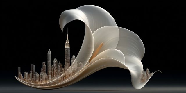 Imagine the vibrancy of urban life interwoven with the serenity of nature, captured in a single breathtaking artwork. Such is the essence of this artistic creation, where delicate, flowing petals gracefully ascend above a meticulously detailed cityscape. The contrast is striking yet harmonious, with the organic curves of the flowers juxtaposed against the straight lines and sharp angles of iconic architectural achievements. The composition uses a monochromatic scheme that is suddenly interrupted by hints of subdued colors within the flora, suggesting life and resurrection amidst the concrete. The petals, translucent and ethereal, seem to dance in the quietude of the night, softly illuminated against the dark backdrop. This piece not only captures the eye but also invigorates the soul with its depiction of resilience and beauty in urban settings.