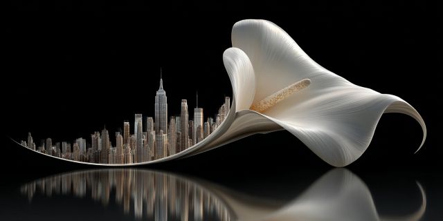 Immerse yourself in a visual journey where the bustling urban life meets the serene elegance of nature. The artwork seamlessly marries a cityscape, intricately detailed with iconic skyscrapers, and an ethereal floral element that bends gracefully across the composition. The contrast is not just visual but symbolic; the rigid, towering forms of the city's architecture are softened by the smooth, flowing curves of a giant calla lily. This juxtaposition is enhanced by the use of reflective surfaces, casting both elements in a unified, tranquil light that invites contemplation and a deeper appreciation for artistic synthesis. The masterful lighting accentuates the delicate textures of the flower, while highlighting the architectural magnificence of the city, creating a striking balance between organic beauty and human ingenuity. Every detail, from the subtle gradations of color in the petals to the precise linear expressions of the skyscrapers, contributes to a feeling of balanced harmony. This piece captures more than a moment; it narrates a hopeful dialogue between natural forms and human creations, suggesting a world where both can coexist in aesthetic synchrony.