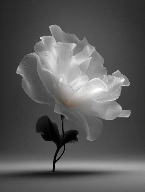 Amidst a soft gradient of gray, an ethereal bloom emerges as a focal point of serenity and refined elegance. The intricate sculpture of this flower embodies a timeless allure, with petals that appear to flutter silently in an unseen breeze. Each fold and curve is rendered with a meticulous fineset, reflecting whispers of light that dance across its delicate surfaces. The profound black stem stands stark against the translucent whiteness of the petals, drawing viewers into a visual symphony of contrast and harmony. This art piece captivates with its simplicity and the profound emotion it evokes, offering a visual retreat from the chaos of the everyday. As a study in contrast and minimalism, it serves not only as a decoration but also as an invitation to pause and reflect. The subtle interplay between light and texture invites contemplation, making it a profound statement piece in any collection. Whether gracing the walls of a modern minimalist living room or the quiet nooks of a contemplative office space, this flower art print becomes a source of inspiration and tranquility.