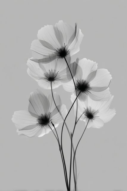 Soft, ethereal petals dance gracefully on a serene grey canvas, evoking a haven of tranquility in monochrome hues. Each petal, although devoid of vibrant colors, bursts with a life force depicted through delicate gradients and stark contrasts. The flowers, elegantly posed, seem to be engaged in a silent ballet, their forms bending and bowing with an inherent elegance that is both soothing and invigorating. The depth achieved through sheer simplicity delivers a powerful visual impact, drawing viewers into a reflective state. The artist has masterfully captured the essence of these blooms with a finesse that transcends mere representation, inviting onlookers to explore the interplay of light and shadow amidst flora.