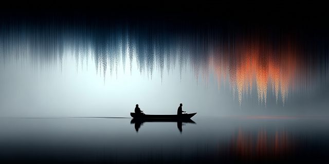 As dawn breaks, the still waters of an unnamed serene lake become the canvas for an ethereal masterpiece. In the center, a solitary boat carries two figures, enveloped in a haunting silence that only early morning can bestow. The sky, a tapestry of deep blues and vibrant oranges, casts reflections that ripple and dance on the water’s surface. These reflections, elongated and delicate, mimic the surreal qualities of a dream, drawing the observer into a meditative state. The scene is not just a visual feast; it's a gateway to tranquility, evoking emotions of peace and introspection.