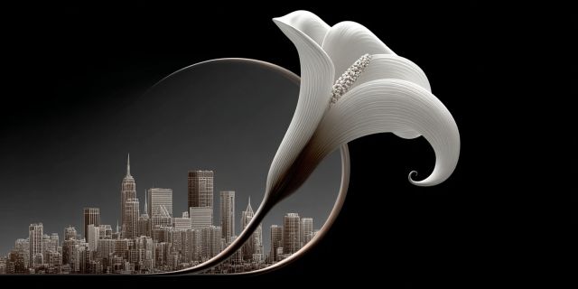 In an extraordinary melding of natural elegance with urban architecture, this piece of art unfolds a visionary spectacle of an intricate flower enwrapping a bustling cityscape. The artwork gleams with contrasts, where the soft, flowing lines of the floral curves passionately embrace the sharp, detailed outlines of skyscrapers. This thought-provoking juxtaposition weaves the delicate beauty of a blooming flower against the robust intensity of urban life, symbolizing the interplay between nature and human construction. The pearlescent tones of the flora coupled with the shadowy hues of the metropolis invite the viewer to ponder the delicate balance between these contrasting worlds. The reflective surface within the curl of the flower cleverly mirrors the city, suggesting a deep, symbiotic relationship between the two subjects. This creation, not just a feast for the eyes but also a prompt for the soul, explores themes of growth, resilience, and mutual dependence. It captures a fleeting instant where beauty and chaos coexist, crafting a narrative that resonates with anyone who finds poetry in paradoxes.