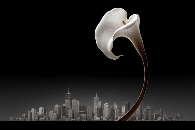 Envision a world where nature intersects with urban elegance, captured mesmerizingly in this artwork. A sleek, stark white calla lily ascends gracefully against a sharply focused backdrop of a bustling city skyline, rendered in dramatic monochrome tones. The lily, with its curves and swirls, echoes the dynamism and rhythm of city life, yet contrasts distinctly with the geometric shapes of the urban environment. This composition invites the viewer to reflect on the juxtaposition of organic beauty and human-made structures. The lily's stem, tinted in earthy browns, sweeps into an elegant arc, suggesting resilience and growth amidst the concrete jungle. The delicate texture of the flower's petals is illuminated with precision, enhancing the visual softness against the hard city lines. This art piece not only captures the tension between natural and architectural forms but also symbolizes the isolation and serenity that one might seek in a hectic world. Each element in the image—the texture, the lighting, the composition—works harmoniously to evoke a sense of peace and contemplation.