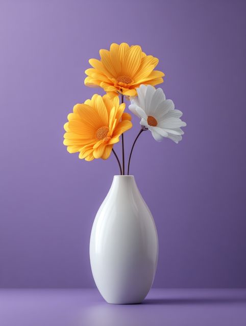 Under the gentle embrace of soft, diffused lighting, two vibrant flowers—an orange and a white bloom—stand gracefully arranged in a sleek, white vase. Set against a serene lavender background, their colors echo the depth and emotion of a classical painting yet speak a language that is strikingly modern. The orange flower, infused with its rich golden hues, symbolizes warmth and energy, unfolding each petal like a sunburst. Adjacent to it, the white bloom, with its pristine petals and golden heart, conveys purity and peace, a delicate balance to its fiery companion.