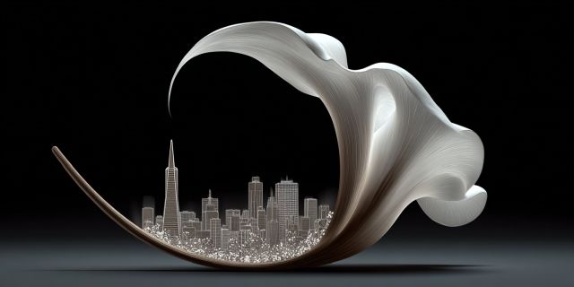 Immerse yourself in the fantastical merger of organic form and urban precision captured in this exceptional artwork. A sculptural wave, lustrous and serenely white, rises and swoops, enveloping a beautifully detailed miniature city. The city, meticulous in its realism, showcases skyscrapers that pierce the calm of a non-descript twilight, their windows aglow with the pulse of unseen life. This juxtaposition of smooth, flowing lines against the structured chaos of urban architecture invites viewers into a contemplative space where two disparate worlds seamlessly converge.