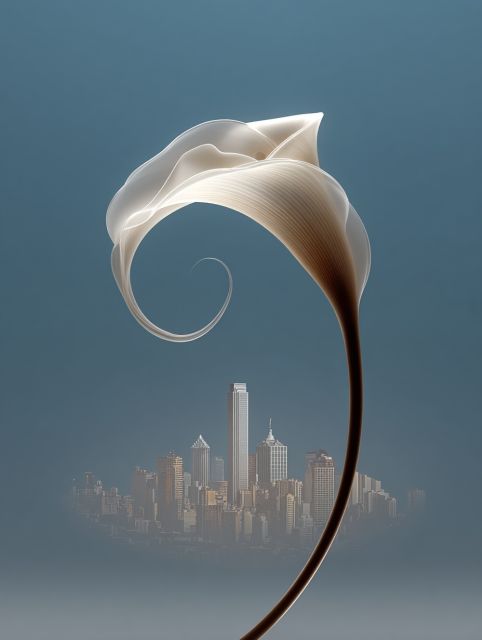 Invoking a blend of nature and urban sophistication, this artwork melds the ethereal beauty of a translucent, sinuous flower with the concrete geometry of a bustling city skyline beneath. The flower, elegant and serene, arcs with graceful curvature, suggesting softness and tranquility. Its delicate, near-ephemeral quality contrasts sharply with the solid, looming structures of the city below, where sharp lines and towering silhouettes carve out a human-made jungle under a muted sky. This juxtaposition creates a visual dialogue between the organic and the manufactured, capturing a surreal harmony that beckons viewers to consider the blend of environment and architecture. The cool, calm color palette enhances the image’s dream-like quality, making it a captivating centerpiece that complements any space with its mystic charm. Each line and curve is rendered with meticulous detail, making the image not just a view but an experience, inviting the onlooker to delve into a scene that bridges different realms.