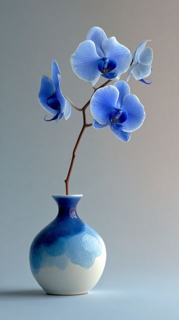 Bathed in soft, shadowed light, a delicate orchid blossoms exquisitely from a gracefully sculpted vase. The petals, tinted in a surreal shade of blue, contrast vividly against the muted backdrop, seem to almost vibrate with a life of their own. Each petal’s smooth texture and gentle curve beckon the viewer closer, inviting a deeper look into the complexities hidden within its simple appearance. The vase, with its deep cobalt hue and an organic white pattern, echoes the beauty of natural landscapes—reminiscent of a frothy sea meeting a bold sky at dusk. The composition balances the fine line between realism and fantasy, crafting a celestial vision rooted in earthly elements. This artwork, with its serene color palette and peaceful symmetry, not only captures the eye but also subtly elevates the soul, making it a timeless piece to cherish.
