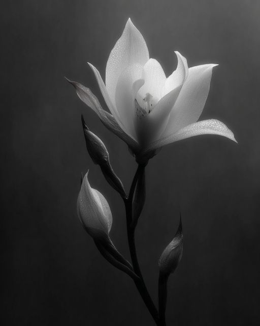 Amidst a subtle gradient from shadow to light emerges an ethereal blossom, its petals unfurling with an elegance that captures the essence of stillness and movement interwoven. The striking monochrome palette enhances the natural architectural form of the flower, lending a timeless grace that beckons the observer into a realm of poetic tranquility. Each petal, kissed with droplets of morning dew, reflects a universe of emotion and delicate beauty, suggesting stories untold and moments preserved in the silent language of nature.