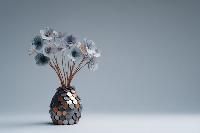Coin-Clad Vase with Ethereal Blooms: A Unique Artistic Expression