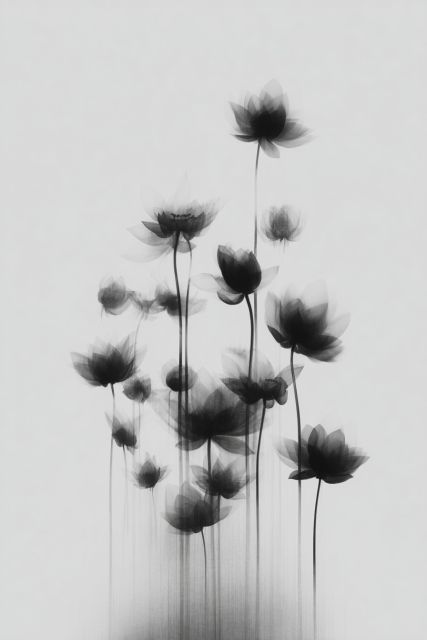 Envelop your senses in the gentle serenity of 'Ethereal Blossoms: A Monochrome Symphony in Floral Artistry'. This exquisite artwork transports viewers into a surreal realm where the simplicity of flowers converges with the nuances of shadow and light. Each flower stands delicately poised, their petals seemingly fluttering in a silent, unseen breeze. The monochrome palette strips away the distraction of color, allowing the subtle interplay of light and shadow to whisper stories of unseen beauty. Bold yet delicate, the flowers' silhouettes radiate a ballet of grace and strength, captured in each elongated stem and soft, curvaceous bloom. The artwork invites contemplation, making it perfect for spaces where calm and beauty are treasured. The fluid, almost liquid-like strokes suggest a timeless dance, organic yet controlled. This piece isn't just an addition to a room; it transforms atmospheres, crafting spaces filled with artistic inspiration and tranquil reflection.