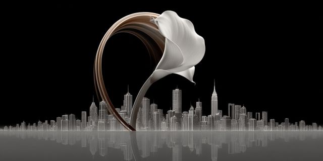 Picture a scene suspended in a serene, surreal space where nature melds with urban majesty. This artwork enchants the viewer with its stark, imaginative juxtaposition—a delicate, almost ethereal flower spiraling gracefully above a meticulously detailed city skyline. The city, a distilled essence of soaring skyscrapers, bridges the realm of human achievement with the organic flow of natural forms, painting a narrative of coexistence and harmony. The flower, rendered with smooth, flowing lines and glowing subtly against a dark backdrop, evokes feelings of peace and tranquility. It arcs gracefully, a balletic flourish of natural beauty that transforms the rigid skyline into a stage for poetic interplay between man-made wonders and the effortless artistry of the natural world.