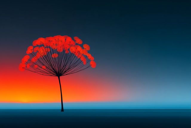 As the day's curtain draws to a close, an enchanting scene unfolds where the radiance of a fiery sunset meets the serene beauty of a silhouetted flower. Against an expansive backdrop that transitions from a deep, tranquil blue to vibrant shades of orange and red, the stark, delicate outline of a floral bloom stands proudly. Unlike any ordinary depiction of flora, this image captures the flower not through the typical lens of verdant colors and soft petals but as a singular, bold silhouette that juxtaposes botanical delicacy against the raw power of the sunset. The composition beckons viewers to appreciate the juxtaposition of strength and fragility, permanence and transience that nature embodies. The sky, painted in broad strokes of color but devoid of clouds, enhances the minimalistic grace of the flower, which spreads its thin tendrils into the air like the careful lines of a master calligrapher. As time seems to pause, each viewer is transported to a moment of reflection, where the mundane meets the sublime. This artwork, more than a mere visual delight, becomes a conduit for meditation and introspection, urging observers to find beauty in simplicity and reminding them of the grandeur of nature's cycles.