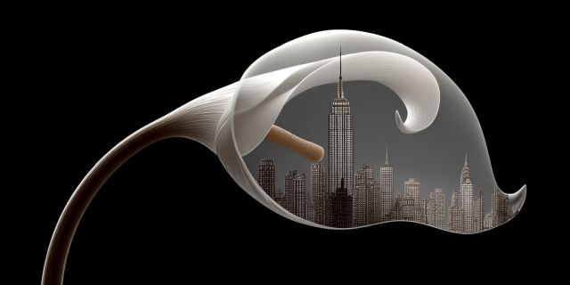 As dusk settles over a bustling cityscape, encapsulated within the gentle embrace of a curling flower stem, a scene of urban exhilaration meets the tranquility of natural form. This artwork masterfully combines the architectural achievements typical of a grand city skyline with the organic beauty of a serene floral element. The rigid contours of towering skyscrapers are softened by the graceful curves of a white petal, suggesting a harmonious coexistence of man-made and natural worlds. This blend of flora and architecture evokes a profound contemplation on the relationship between human enterprise and natural beauty. Each building, though minutely rendered in this fantastical scope, stands out with clear definition under the shimmer of twilight. This scene is not just a visual treat but a narrative of contrast and synthesis—where the hustle of city life is muted by the flower’s sublime purity. The soft glow that emerges from the backdrop highlights the buildings, crafting a visual spectacle that invites viewers to explore every detail. The image’s depth is enriched with layers of texture—the silky smoothness of the petal against the crisp edges of urban structures. This piece invites the viewer to a moment of pause, a breath of fresh air amidst the concrete jungle, reminding us of the delicate balance our world ideally seeks.