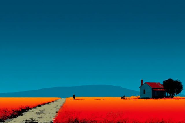 A solitary path in art often symbolizes a journey, personal or spiritual, and can evoke feelings of introspection and discovery. This image, with its stark, vivid colors and the presence of a lone figure against the vastness of nature, enhances its metaphorical meaning. The path invites viewers to venture into their thoughts, paralleling the physical journey of the figure with one's mental or emotional exploration.