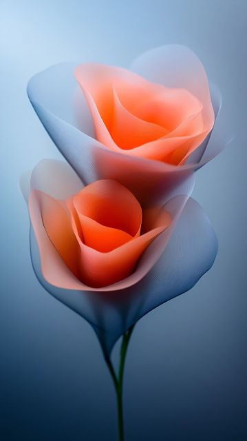 Nestled against a serene blue backdrop, the image presents a sublime flower, unfolding in hues of transcendent orange and calming blue. Each petal appears meticulously sculpted, resembling delicate wisps of silk illuminated from within. The gentle curve of the petals creates a mesmerizing symmetry, while the flower's heart seems to pulse with a life of its own, casting a soft glow that radiates pure serenity. This artistic rendition captures the essence of ephemeral beauty, reminding the viewer of the fleeting, delicate nature of life itself. The play of light and shadow adds depth, enhancing the ethereal quality of the flower, making it almost otherworldly. This print, perfect for bringing a touch of tranquility and sophistication to any space, invites viewers to pause and reflect on the elegance that nature holds.