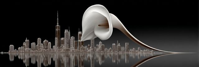 Immerse yourself in the striking juxtaposition of organic beauty and architectural prowess in this captivating artwork. A solitary, elegantly twisted calla lily stands in the foreground, its sleek, swirling form bathed in a pristine monochromatic glow. The flower's graceful curve and smooth, reflective surface contrast dramatically with the intricate, distant skyline behind it. This cityscape, a meticulously detailed panorama of towering skyscrapers, manifests an urban jungle sketched in shades of gray, suggesting both grandeur and the bustling silence of a reflective, quiet night. The artwork's reflective surface weaves together these two realms, city and nature, into a seamless, surreal mirror image, encouraging a contemplative mood amongst viewers. Delicate yet powerful, this image is not just a visual treat; it invites narratives about nature's elegance amidst man-made marvels, echoing themes of coexistence and the intersection of different worlds. Here, the timeless beauty of a single flower challenges the ephemeral existence of the urban landscape, creating a dialogue between transience and permanence.