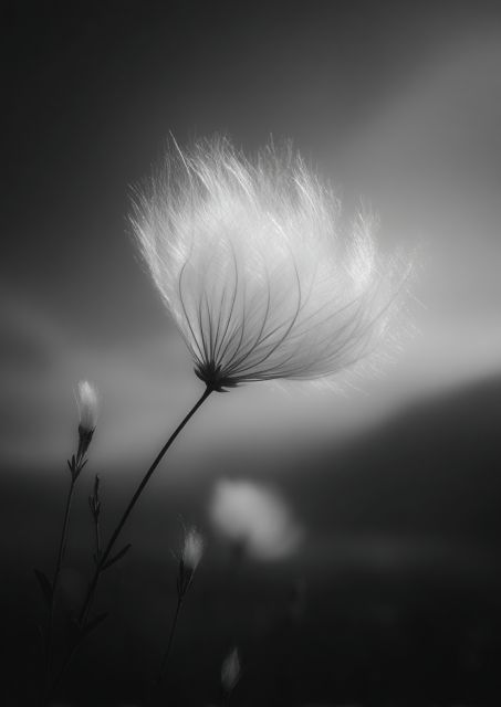 As if plucked from a realm where shadows and light dance in eternal harmony, the depicted flora in this artwork stirs a deep serenity within the viewer’s soul. The gentle silhouette of the delicate flower is masterfully captured against a soft, diffused background, where the outlines of distant vistas barely emerge through the mist. The exquisite detail of the gossamer-like strands, radiant in their simplicity, exudes a sense of peace and an almost tactile softness. This artwork is a poignant reminder of nature's transient beauty, poised in a timeless ballet of grace and fragility. The monochrome tones enhance the texture and form of the flower, inviting the onlooker into a meditative contemplation. Here, the essence of beauty is distilled, not through the riotous colors of a blooming meadow, but through the stark, compelling allure of contrast and minimalism. Each strand of the flower's plumage is highlighted, casting an ethereal glow that seems to illuminate from within. This print is not merely a visual delight; it offers an introspective journey to the quieter corners of one’s thoughts, prompted by the stark yet soothing presence of nature captured at a moment of sublime elegance.