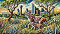 Mother Bobcat and Cub in Cubist Dallas: A Vivid Texas Landscape