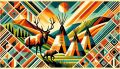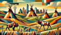 Vibrant Cubist Interpretation of Cedar Bluff with Wildlife and Tipis