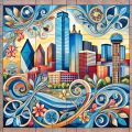 Vibrant Artistic Rendition of Dallas Skyline with Cultural Symbols